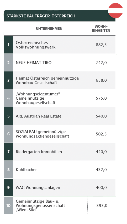 Als stärkster Bauträger Österreichs nach Neubauleistung erwies sich das Österreichische Volkswohnungswerk mit rund 883 fertiggestellten Wohneinheiten, gefolgt von Neue Heimat Tirol sowie Heimat Österreich (Quelle: Immobilien Magazin):